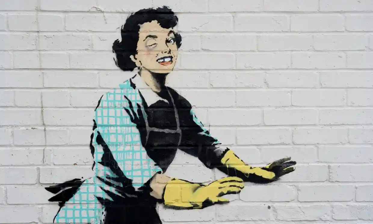Confirmed around 07:30 GMT, the painting, which is in Park Place (rear of Grosvenor Place, near Margate fire station), is a comment on domestic violence and shows a 50s-style housewife suffering a swollen shut eye, shoving, presumably, her husband into a dumped chest freezer.