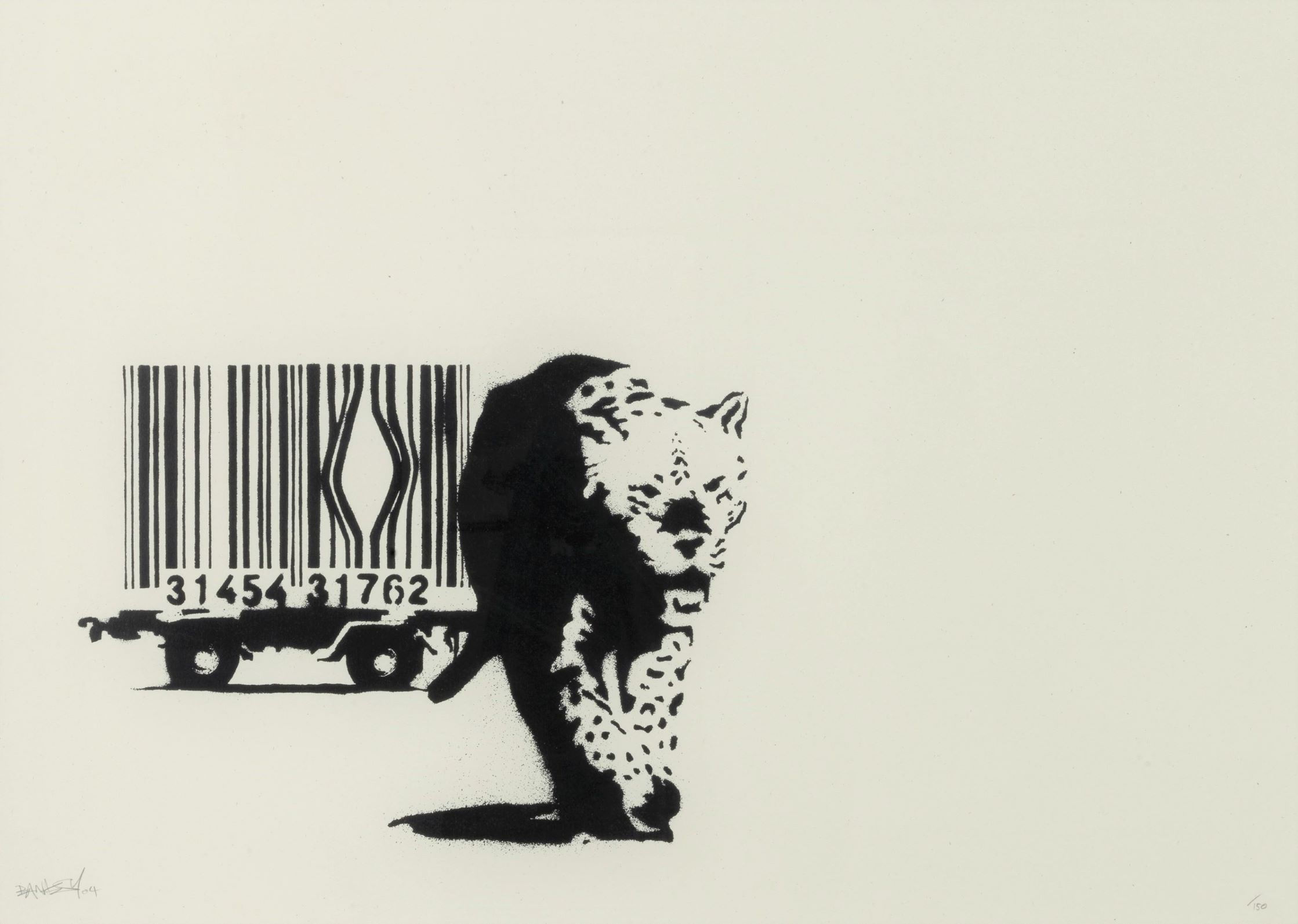 Another way Banksy presents innocence in his art is through his use of animals. For example, in his work “Barcode” we see a leopard escaping from its cage whose bars are a barcode.Menacingly emerging towards the viewer, the organic matter of the leopard is juxtaposed with the digital, ethereal world of barcodes (like Neo escaping the Matrix) as nature fights from man’s attempt to contain it.