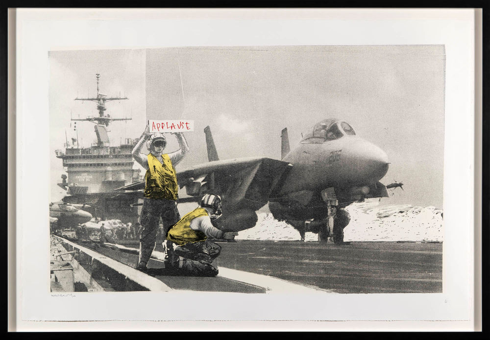 Banksy's signed print "Applause" was first released in 2006 during the renowned Barely Legal exhibition, held in a Los Angeles warehouse. "Applause" is part of the iconic Barely Legal set, which also includes "Grannies," "Trolleys," "Morons," and "Festival." Measuring approximately 80 x 112 cm, "Applause" is the largest Banksy print. The artwork depicts a fighter jet on an aircraft carrier's runway, inspired by a famous image of former U.S. President George W. Bush delivering the "Mission Accomplished" speech after the Iraqi invasion. Flanking the jet are two air traffic controllers in bright yellow, high-visibility jackets, preparing the jet for takeoff. One controller holds a sign reading "APPLAUSE," similar to those used in comedy theatres to prompt the audience to cheer on cue.